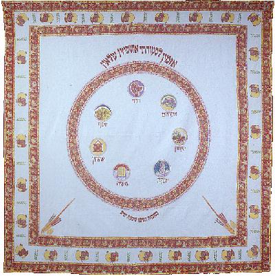 The perfect way to build a Sukkah with this beautiful wall hanging. Our Sukkah panel features lulavs, etrogs, and pomegranates and is big enough to form one entire wall of your Sukkah. Complete with easy-hang loops. Hand block-printed on 100% Indian cotton. Design may vary. New colors for '96. 86"x86". Cat. No. 01-06-E . . . . . $125 |