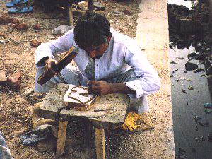 Once color-fast dyes are applied, carvings are meticulously placed by hand.